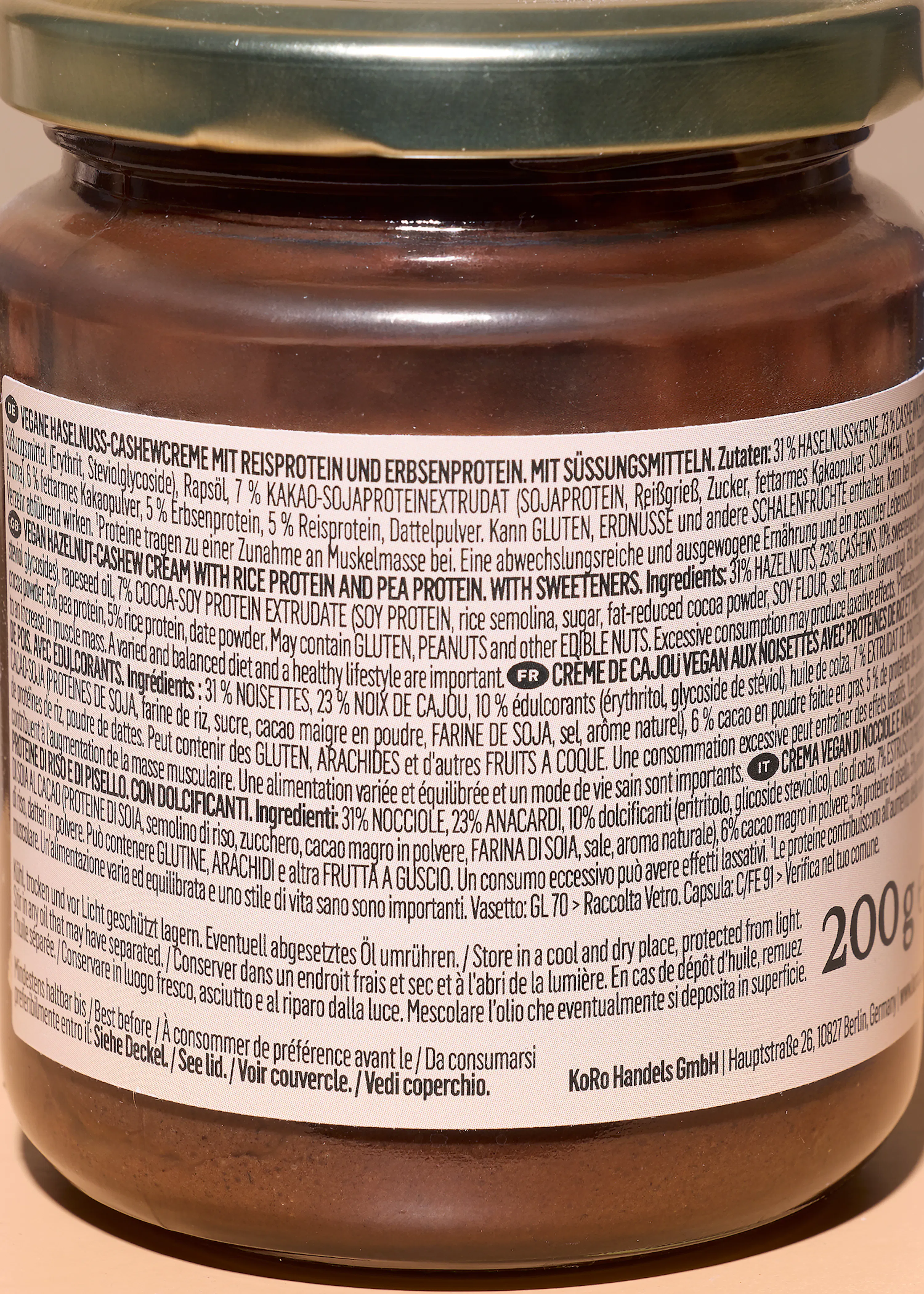 | Verkehrsbezeichnung | Vegane Haselnuss-Cashewcreme mit Reisprotein und Erbsenprotein. Mit Süßungsmitteln |